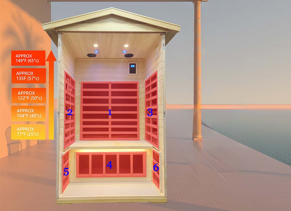 The six carefully positioned carbon crystal heating panels are located on the back, sides, lower legs, ensuring 360° heat coverage throughout the entire sauna. Under standard testing conditions, the temperature can reach nearly 149°F (65°C).