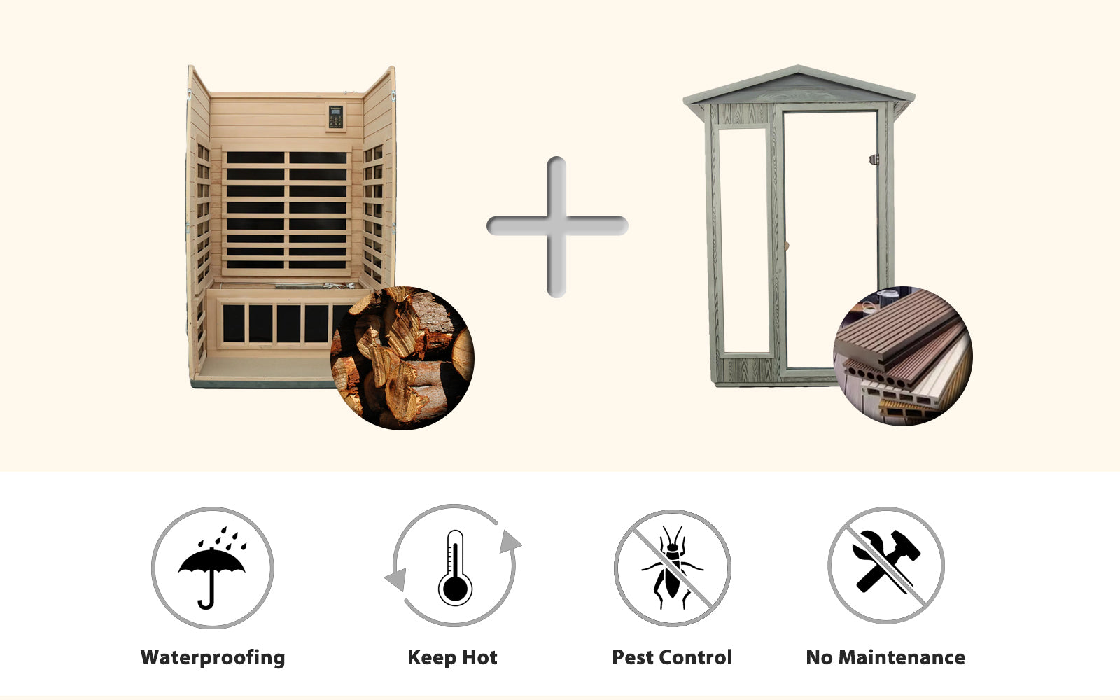 The VF02 is crafted from durable wood-plastic composite, designed to keep water out and lock in heat for a cozy sauna experience. Its natural resistance to pests means you won’t have to worry about damage, and best of all, it requires no maintenance—perfect for enjoying your outdoor sauna hassle-free year-round.